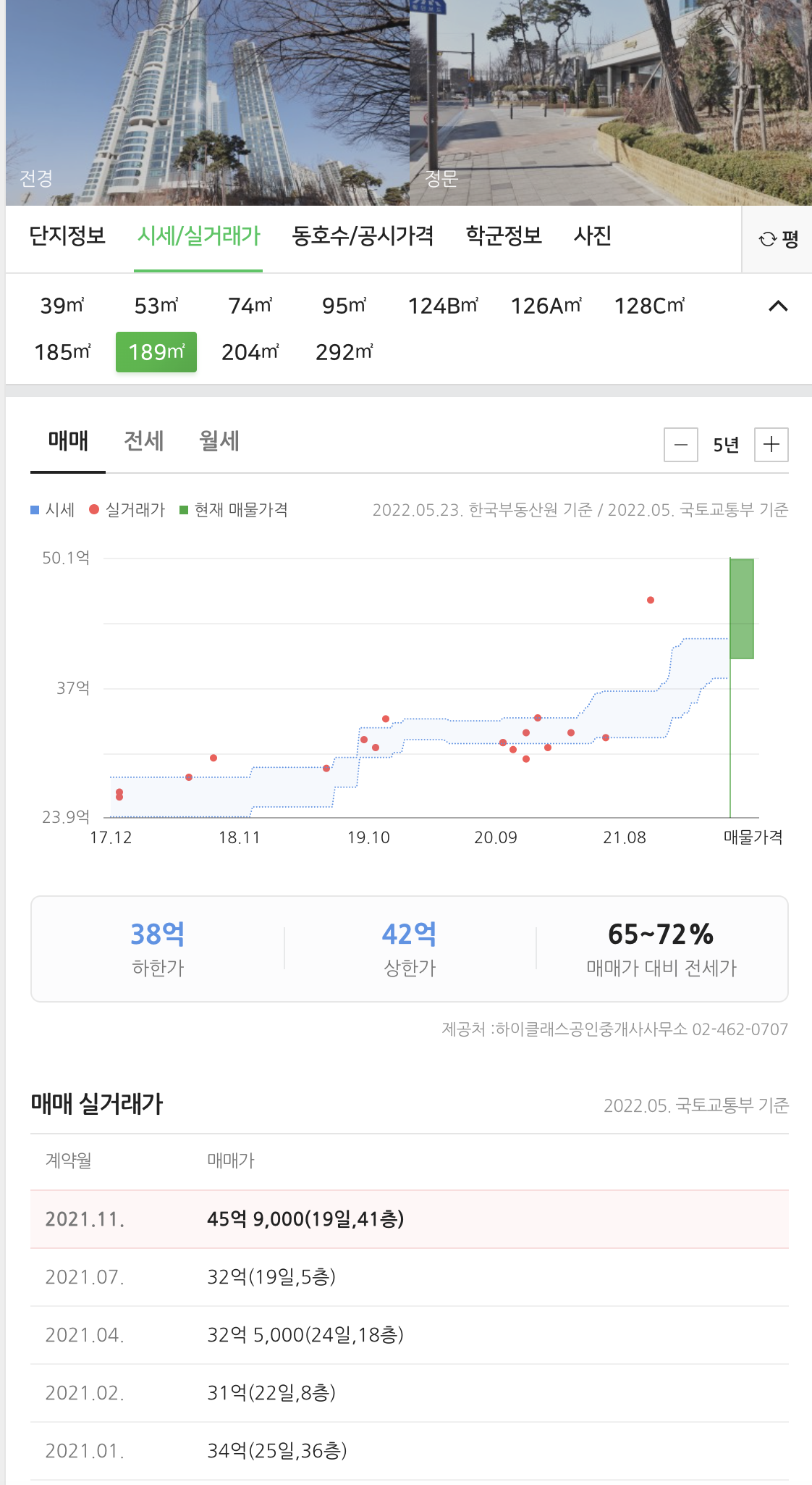 공급면적 189.02㎡(약 57평), 전용면적 140.30㎡(약 42평) 규모다. 2017년 5월 매입했다. 거래가액은 24억4460만원이다.